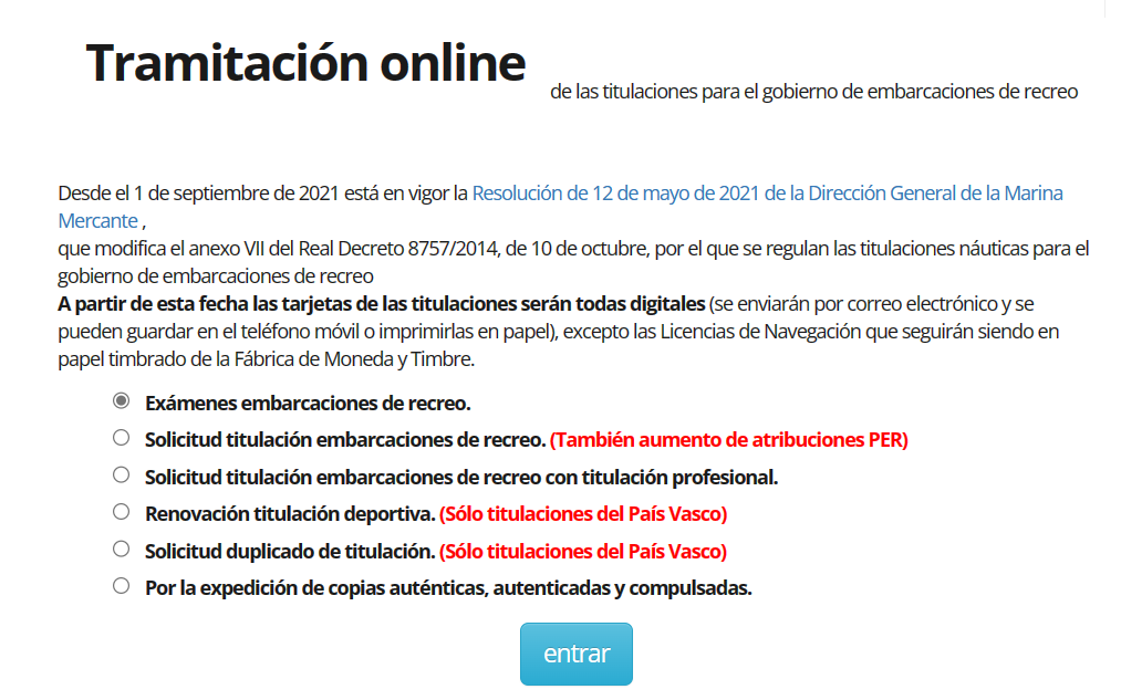 Nos aparecerá una web como la que tenemos en la imagen de arriba y seleccionaremos la primera opción «Exámenes embarcaciones de recreo» que ya viene marcada por defecto y pulsaremos en el botón de «entrar«